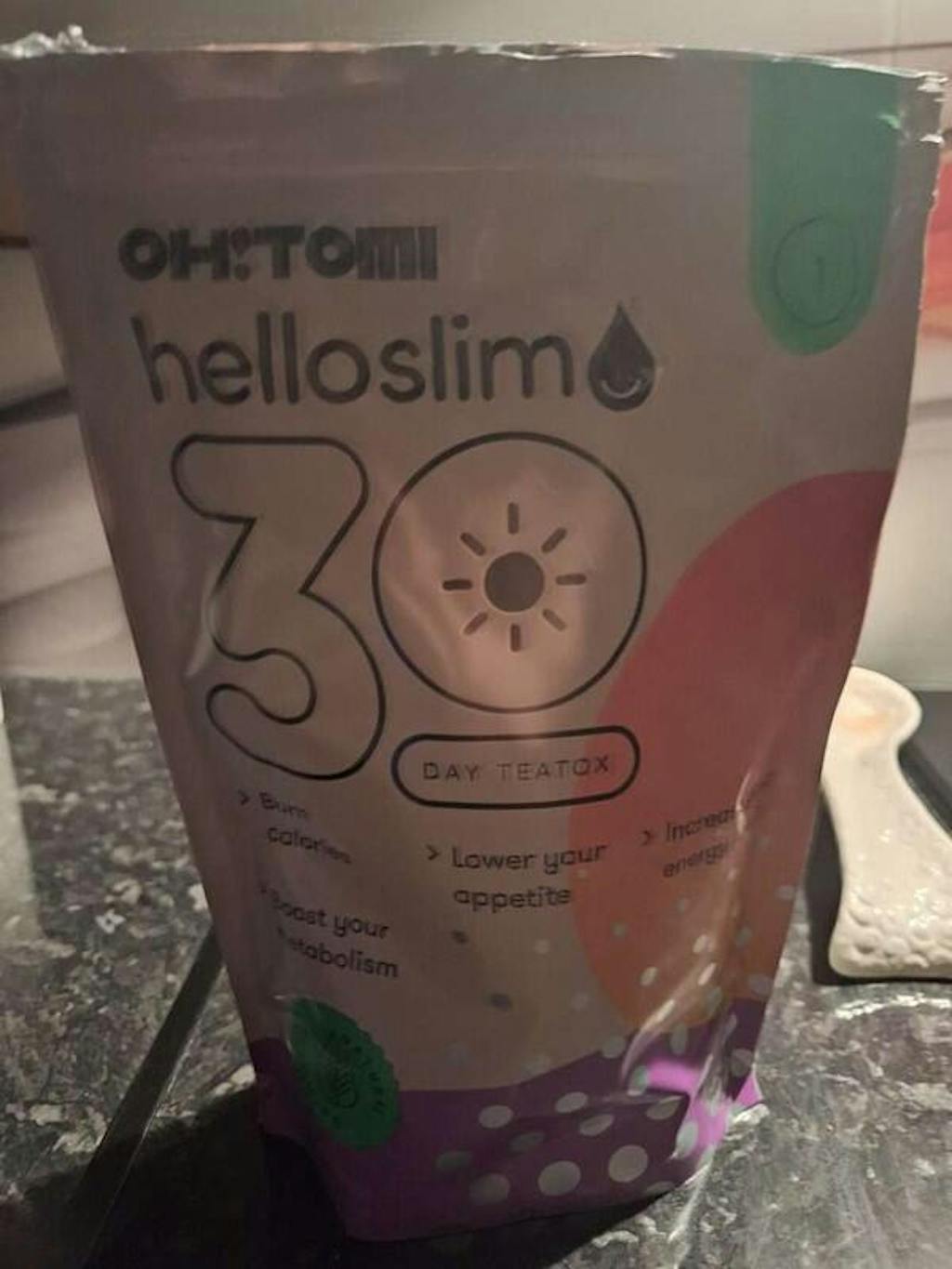 Το τσάι Hello Slim Night Tea από την Oh!Tomi αποτελεί μέρος του teatox δύο βημάτων. Έχει αναπτυχθεί για δραστήριους ανθρώπους που θέλουν να ηρεμήσουν στο τέλος μιας έντονης ημέρας. Στη σύνθεση του τσαγιού θα βρείτε μόνο φυσικά συστατικά όπως μέντα, λεμονόχορτο, φλούδα πορτοκαλιού, ρίζα τζίντζερ, μήλο, ρίζα κιχωρίου και γλυκόριζα.