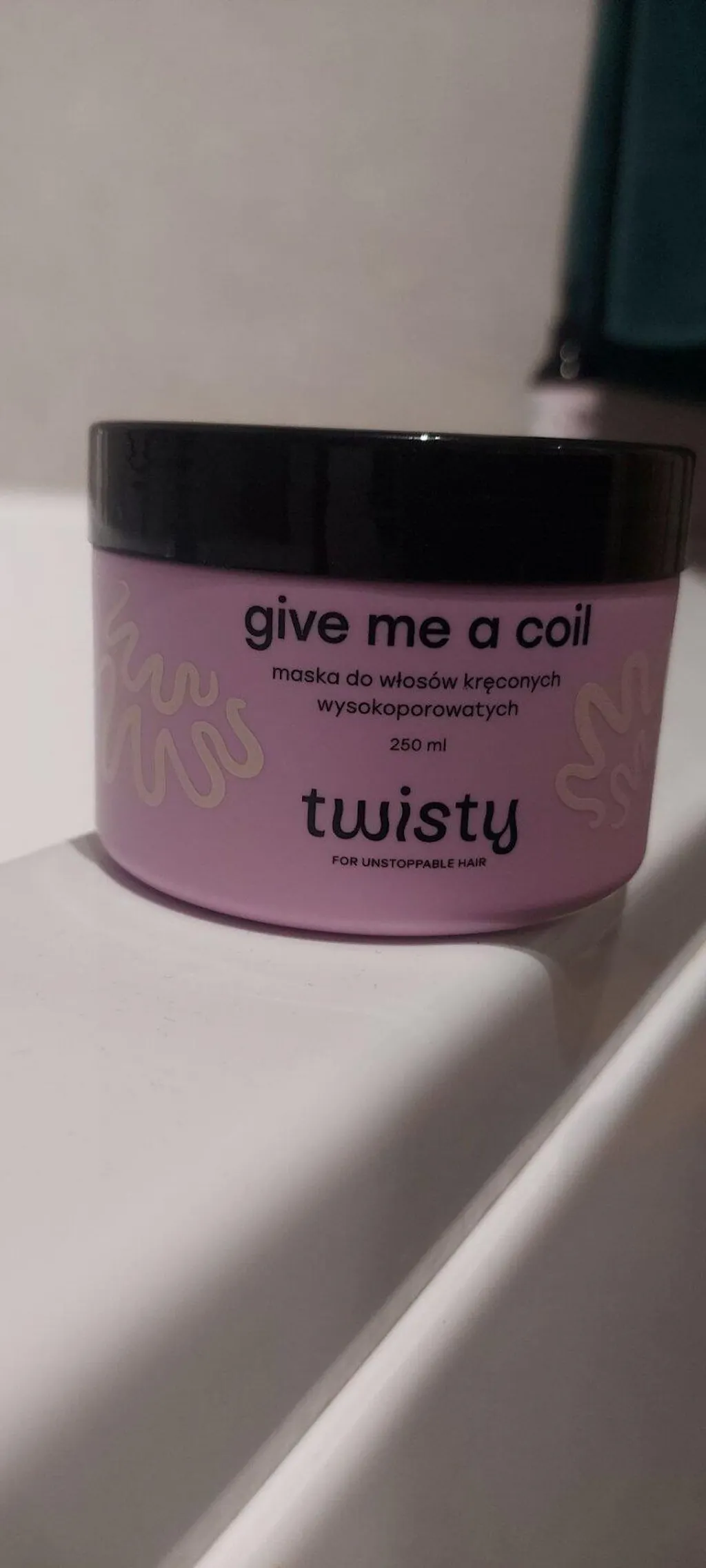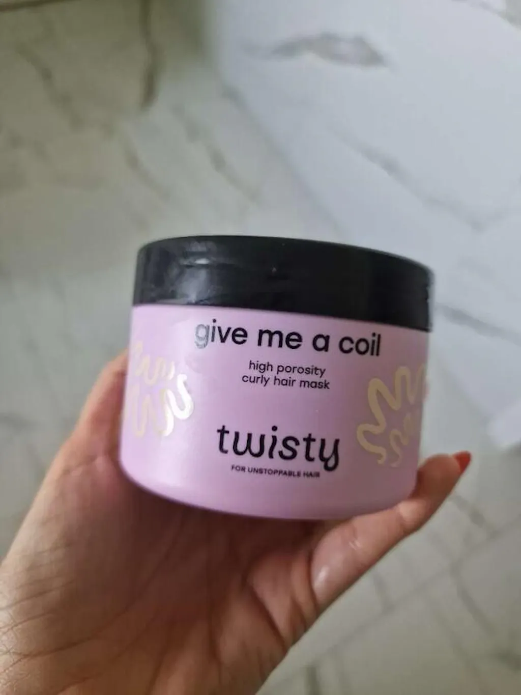 Η μάσκα σγουρών μαλλιών Give Me a Coil της Twisty επαναφέρει τη λάμψη, δυναμώνει τις μπούκλες και ενυδατώνει. Οι τούφες γίνονται πιο εύκαμπτες και χτενίζονται ευκολότερα. Το 98% της σύνθεσης αποτελείται από φυσικά συστατικά, όπως βάλσαμο copaiba, ελαιόλαδο, βούτυρο καριτέ και έλαιο κάνναβης. Χάρη στα πρόσθετα αλλαντοΐνη, πανθενόλη και ουρία, τα μαλλιά θα παραμείνουν ενυδατωμένα. Η θρεπτική και αναπλαστική δράση παρέχεται από την υδρόλυση πρωτεΐνης σιταριού, επηρεάζοντας τηνελαστικότητα και το εύκολο χτένισμα των μαλλιών.