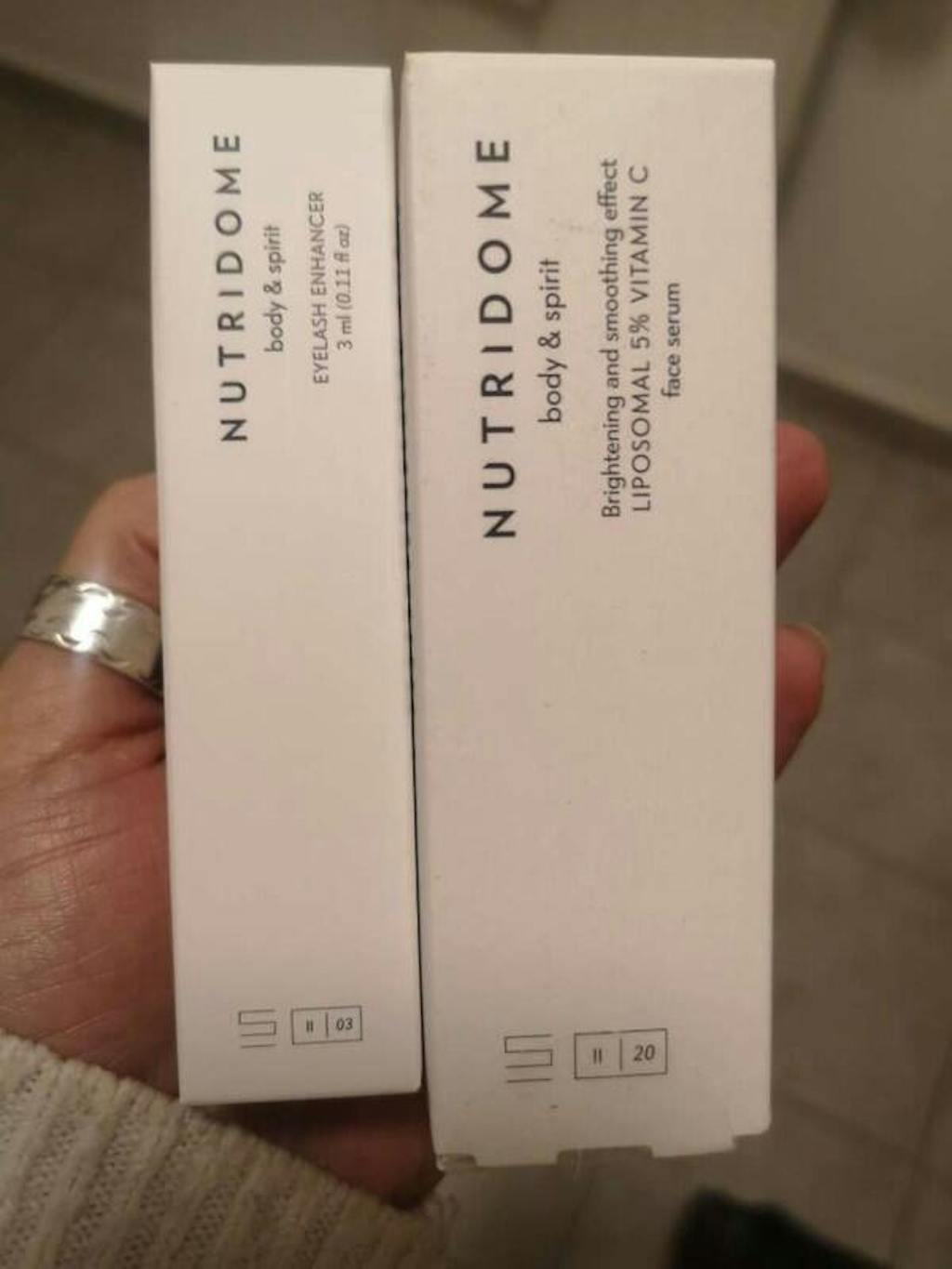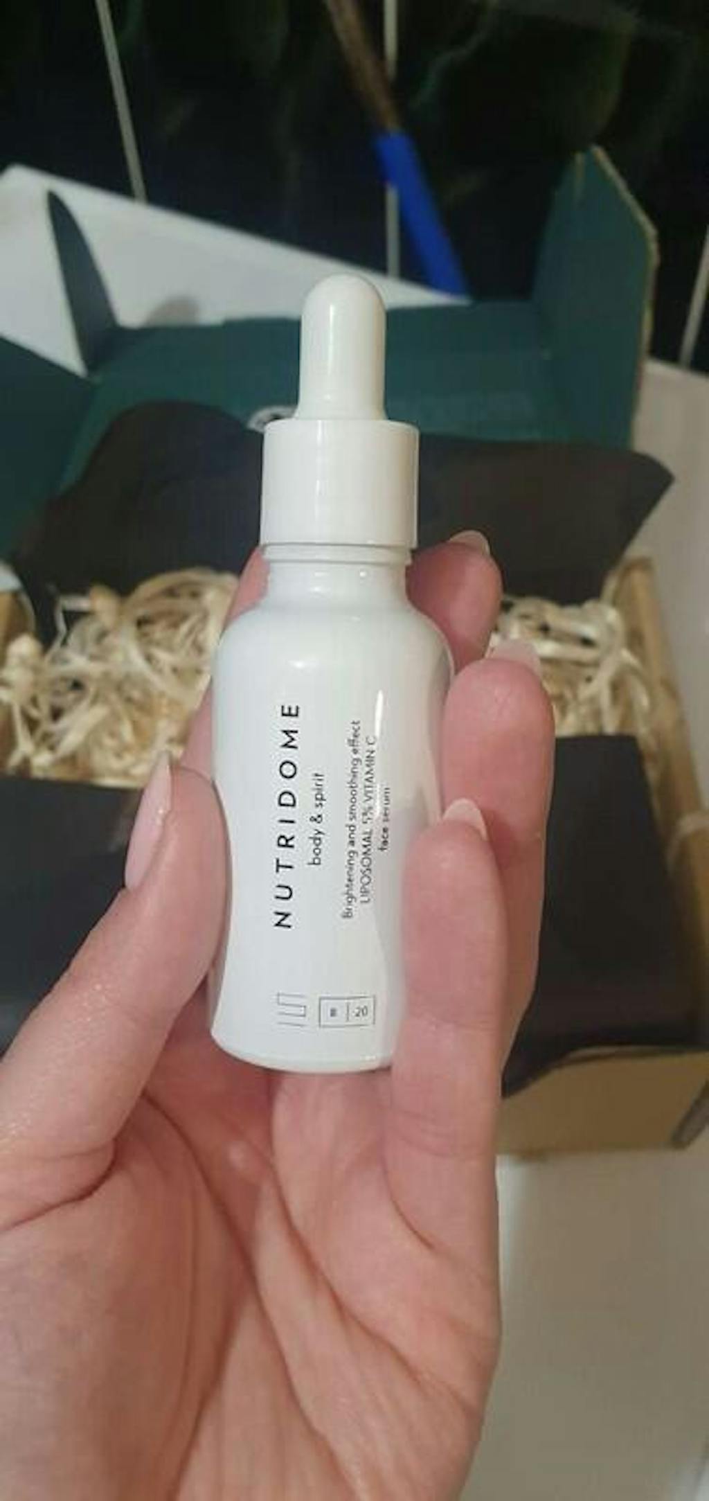 Ο ορός προσώπου με βιταμίνη C της NUTRIDOME περιέχει εκχύλισμα κόκκινων φυκιών, το οποίο είναι εξαιρετικό για την προστασία της επιδερμίδας. Αυτό το συστατικό είναι αντιοξειδωτικό - καθυστερεί τη γήρανση του δέρματος και φωτίζει απαλά την επιδερμίδα. Το εκχύλισμα λουλουδιών νούφαρου, εν τω μεταξύ, θρέφει το δέρμα, δρα ως αντισηπτικό, επιταχύνει την επούλωση και έχει τονωτική δράση. Η λεκιθίνη βελτιώνει την ενυδάτωση. Ο ορός προσώπου με βιταμίνη C της NUTRIDOME περιέχει επίσης πανθενόλη, ένα ενυδατικό με αντιφλεγμονώδεις ιδιότητες. Το συστατικό επιταχύνει επίσης την επιδερμική αναγέννηση και καταπραΰνει τους ερεθισμούς. Το NUTRIDOME Vitamin C Face Serum περιέχει επίσης βιταμίνη Ε, η οποία έχει αντιοξειδωτική δράση, βελτιώνει τη ροή του αίματος στο δέρμα και προλαμβάνει τους ερεθισμούς και τις φλεγμονές. Το ασκορβικό οξύ, με τη σειρά του, επιβραδύνει τη διαδικασία γήρανσης, κάνει απολέπιση και προστατεύει από την ακτινοβολία UVA και UVB.